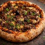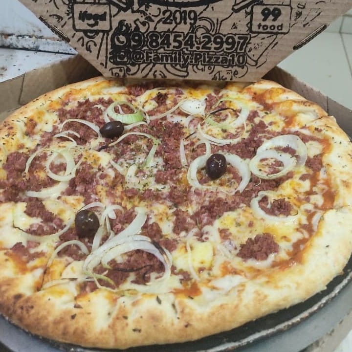 Molho, Mussarela, Charque, Cebola, orégano e Azeitonas