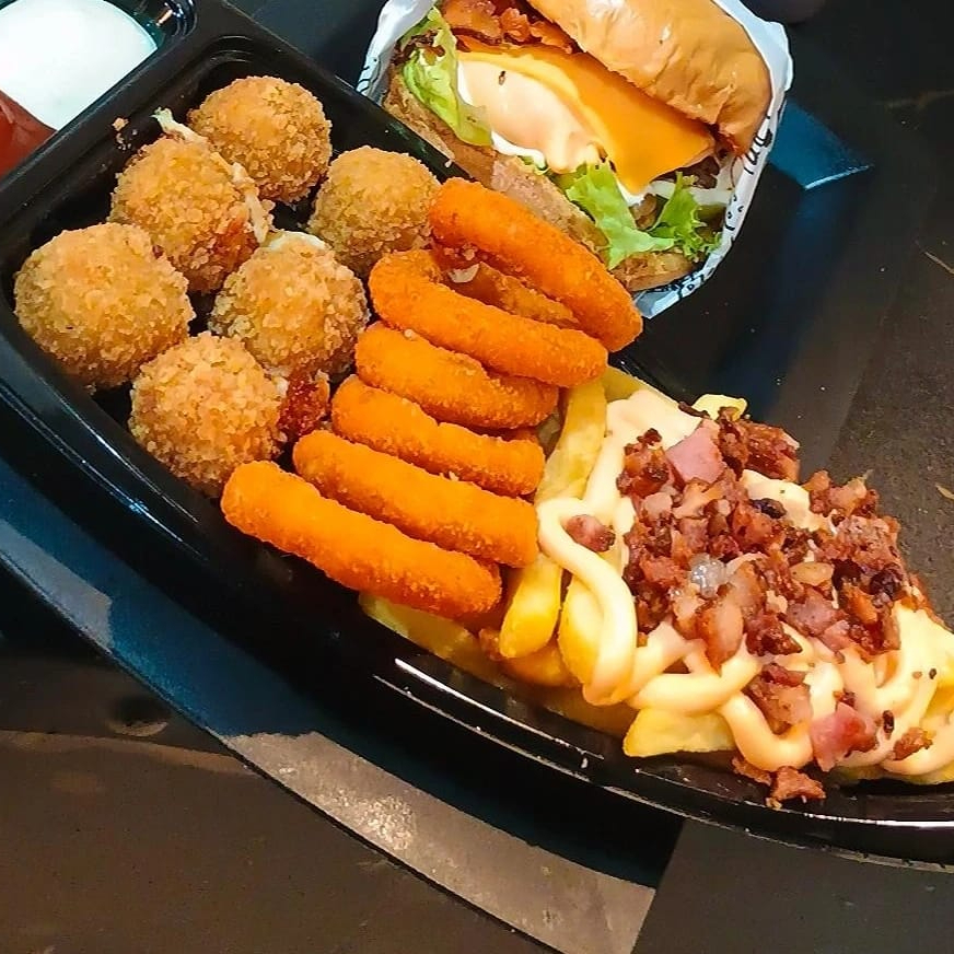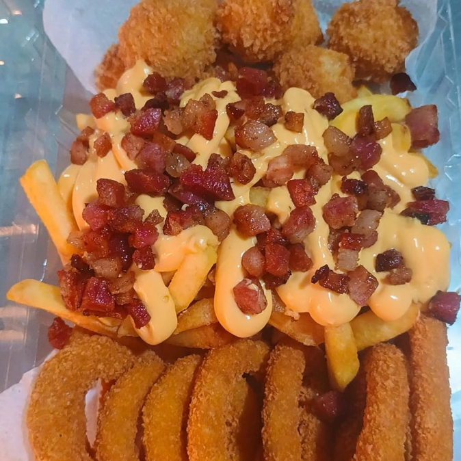 Batata crocante com cheddar e bacon, 5 anéis de cebola empanados e 5 unidades de queijo coalho empanado no panko. A combinação perfeita de crocância e sabor para acompanhar qualquer pedido!