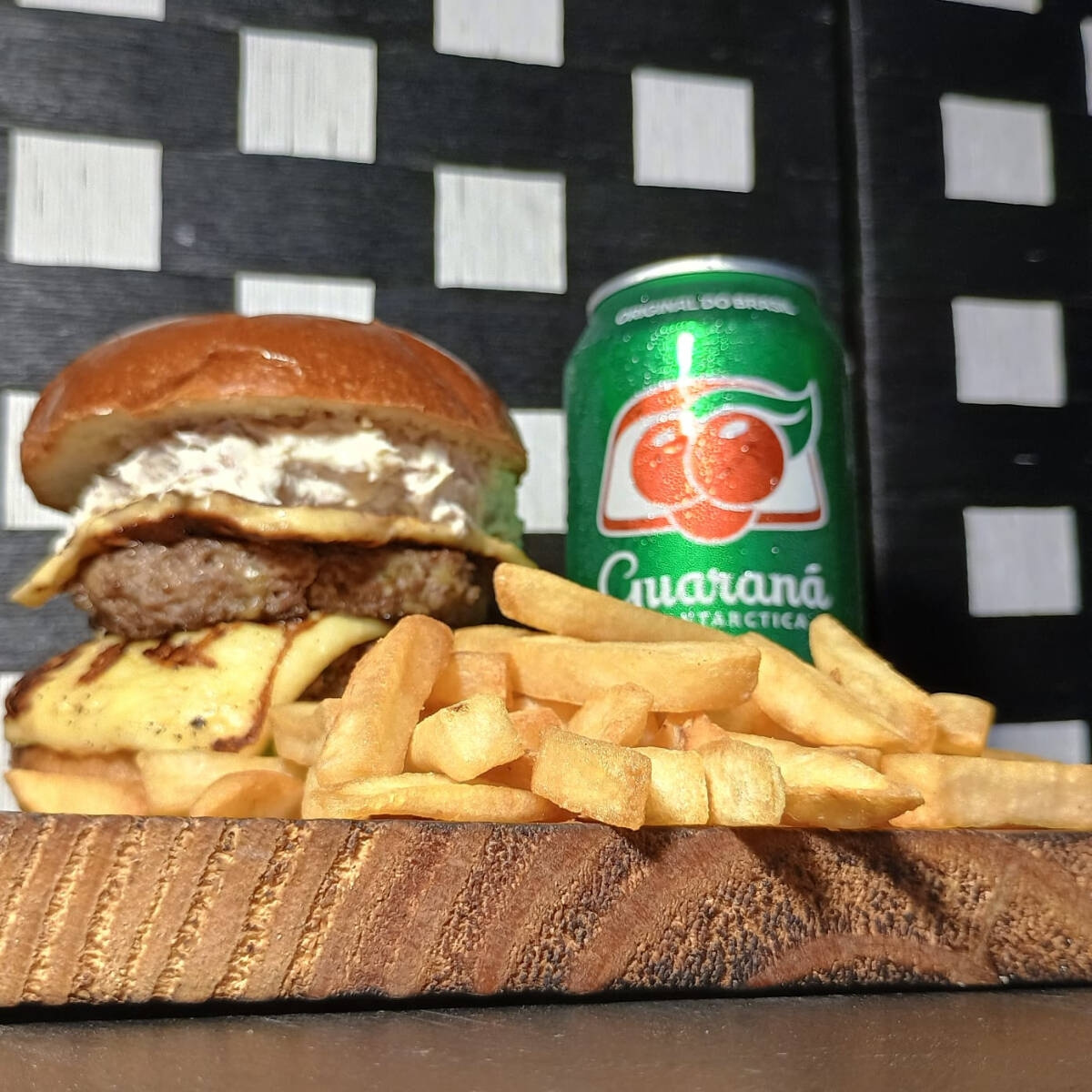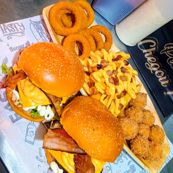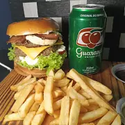 2 hambúrgueres Beef suculentos, batata crocante com cheddar e bacon, 8 anéis de cebola crocantes, 8 bolinho de queijo e 1 Guaraná Antarctica 1L. A combinação perfeita de sabores para quem está com muita fome! [Pão gourmet macio, 2 carnes artesanais de 90g, queijo cheddar derretido, molho cheddar cremoso, bacon crocantes e maionese de bacon. ]