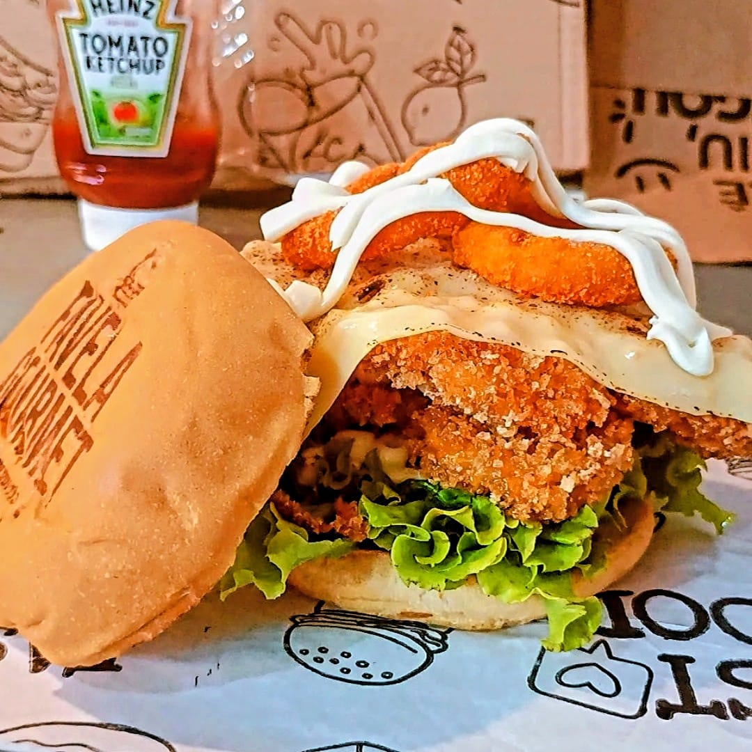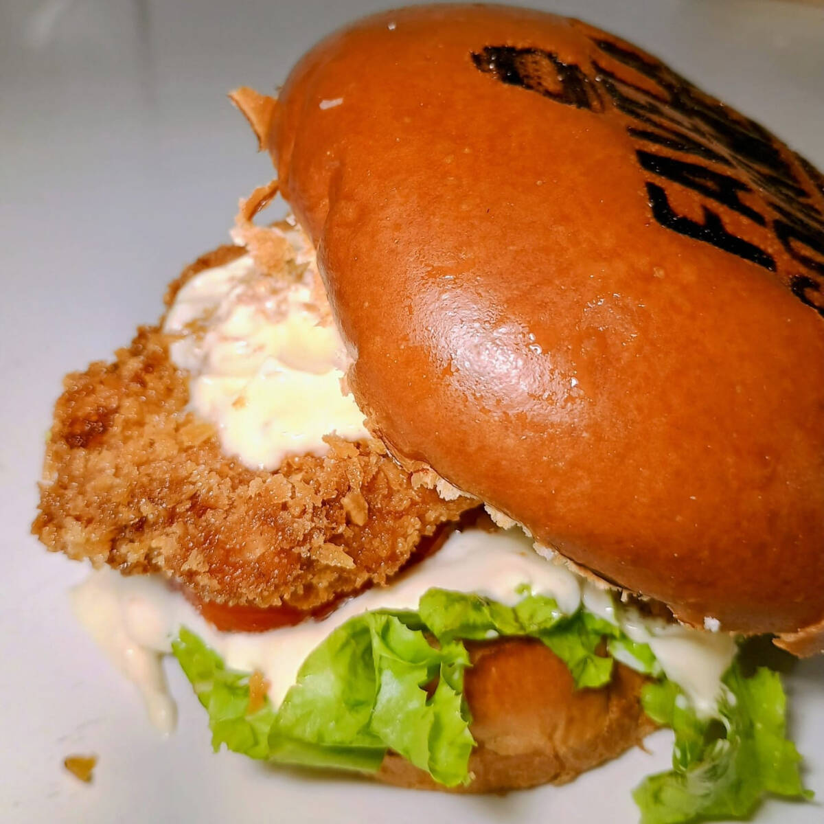Pão fresquinho, 2 filés de frango empanado no panko e frito, maionese de bacon, queijo mussarela maçaricado, creme cheese cremoso E salada KFC