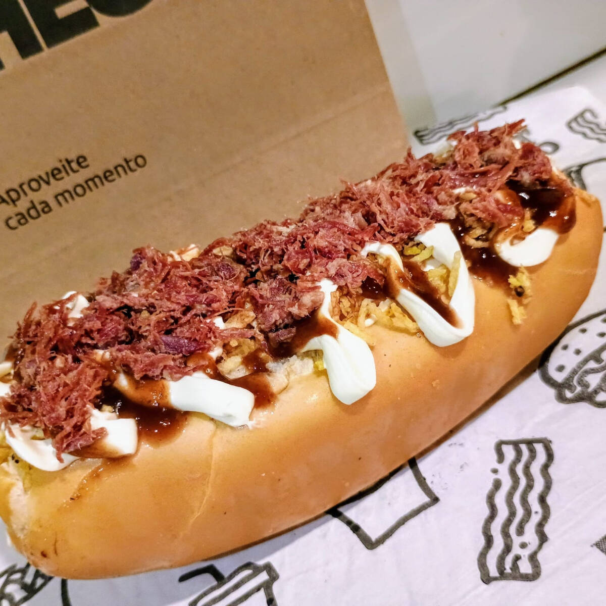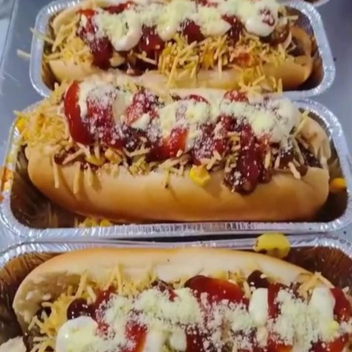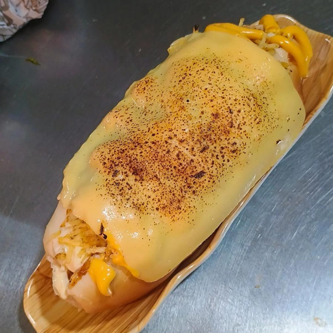 Pão fresquinho, salsicha ou carne (ou frango), coberto com ketchup, maionese de bacon, batata palha crocante, queijo ralado, milho, ervilha, tomate e cebola.