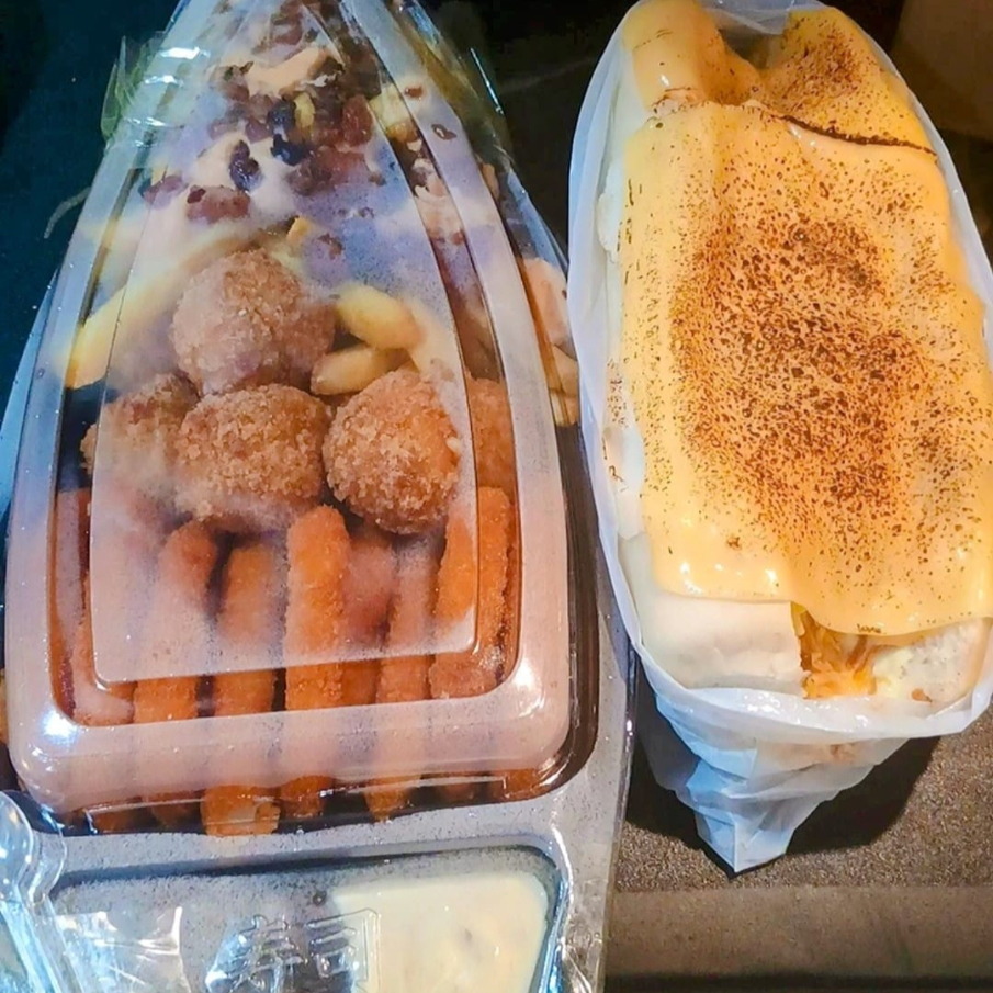 1 hot dog maçaricado irresistível, batata crocante com cheddar e bacon, 5 anéis de cebola crocantes e 5 bolinho de queijo O combo perfeito para quem ama um mix de sabores e muito crunch! [ [Pão fresquinho, com sua escolha de carne ou frango, maionese de bacon, barbecue batata palha , molho cheddar e queijo mussarela ]