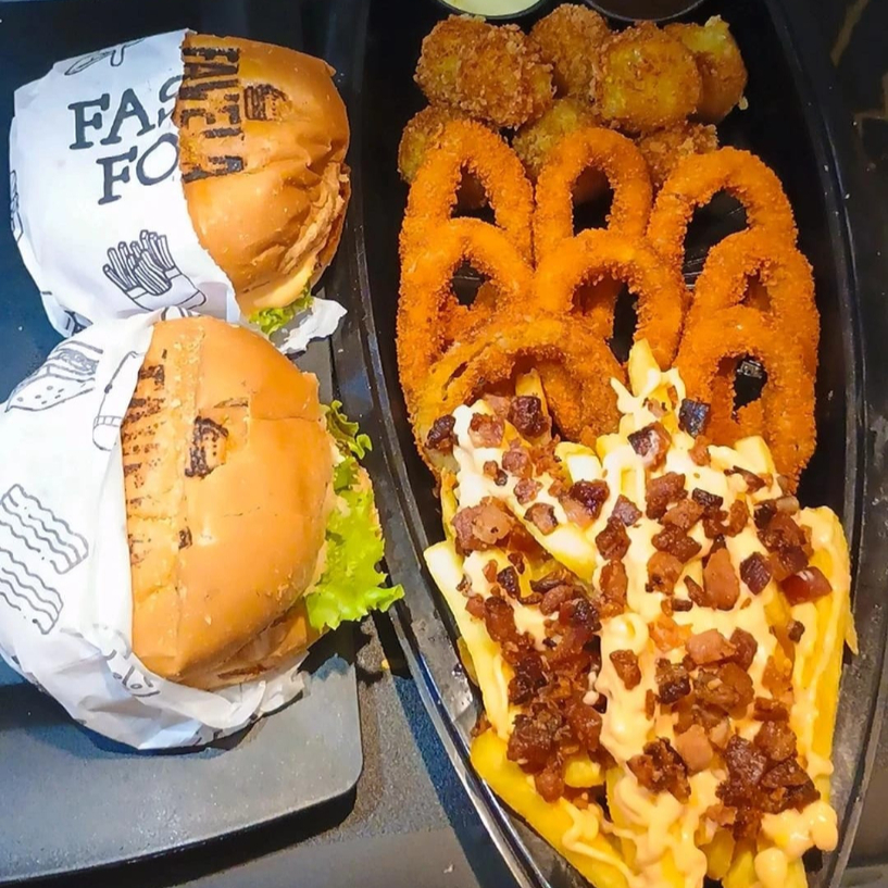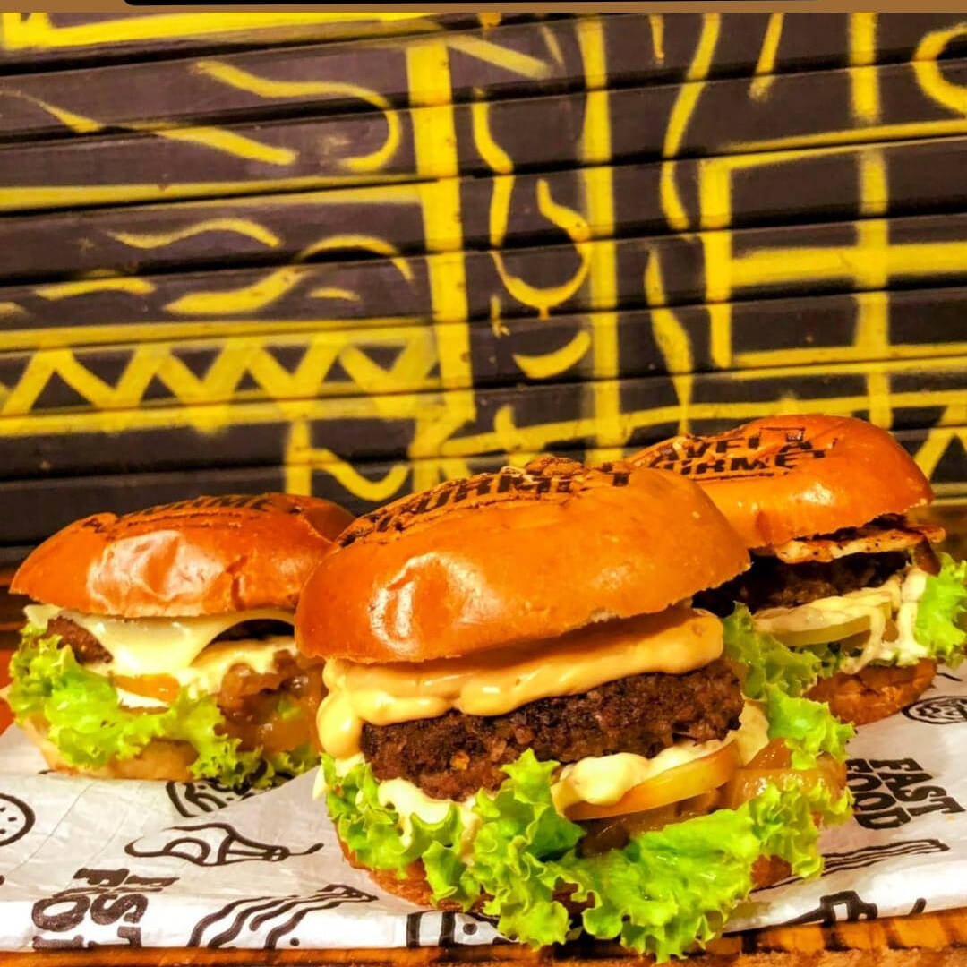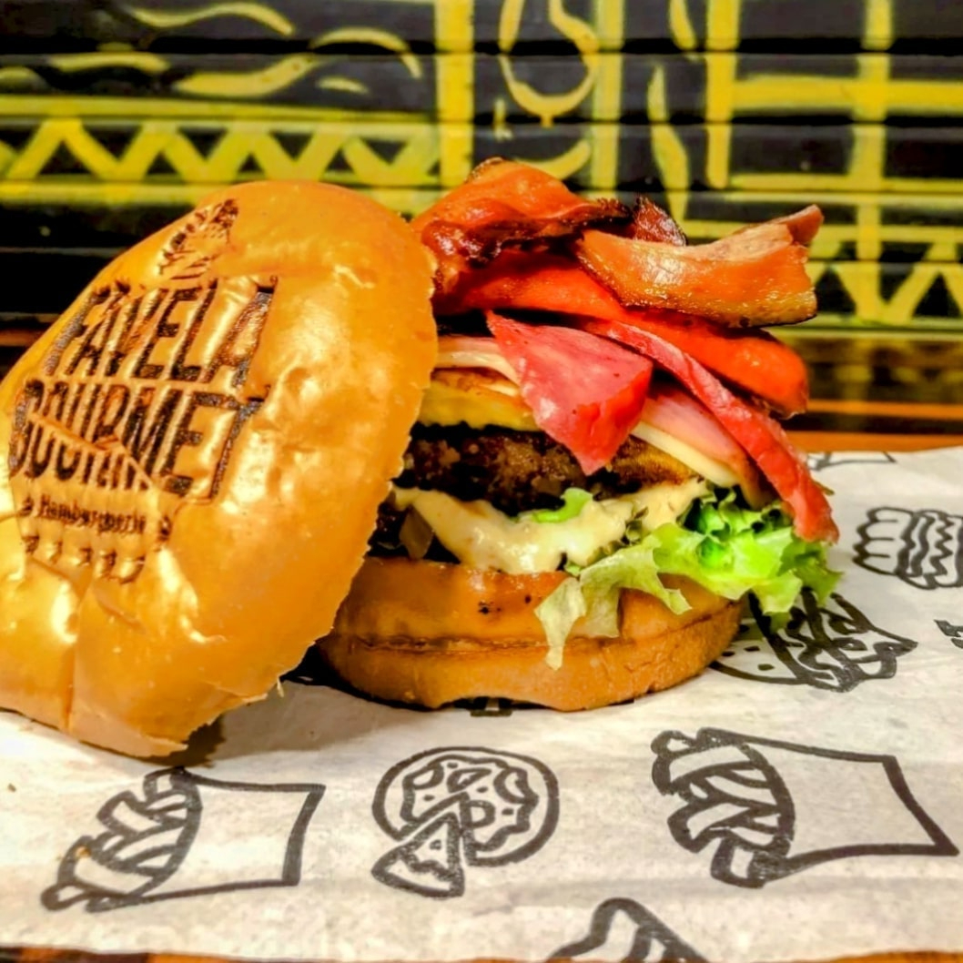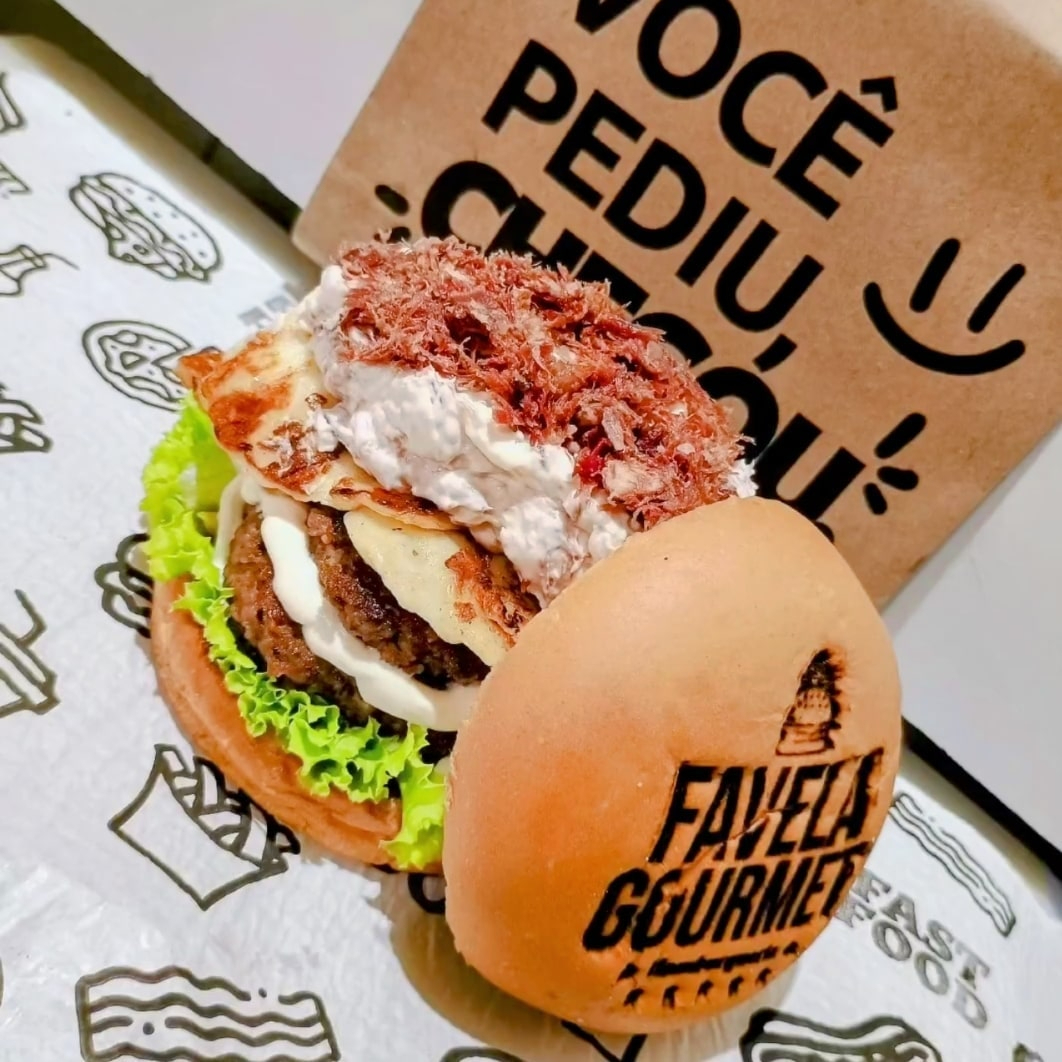 1 Favela Burger e 2 Hot Dogs Maçaricados, perfeitos para quem quer saborear uma refeição completa e cheia de sabor! [Pão macio, carne artesanal de 100g, molho cheddar cremoso, queijo cheddar derretido, bacon em tiras crocantes e creme cheese. salada kfc ] [Pão fresquinho, com sua escolha de carne ou frango, maionese de bacon, barbecue batata palha , molho cheddar e queijo mussarela ]