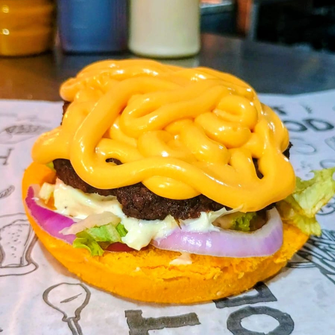 Pão fresquinho, com sua escolha de carne ou frango, maionese de bacon, barbecue batata palha , molho cheddar e queijo mussarela [Pão fresquinho, com sua escolha de carne ou frango, maionese de bacon, barbecue batata palha , molho cheddar e queijo mussarela ]
