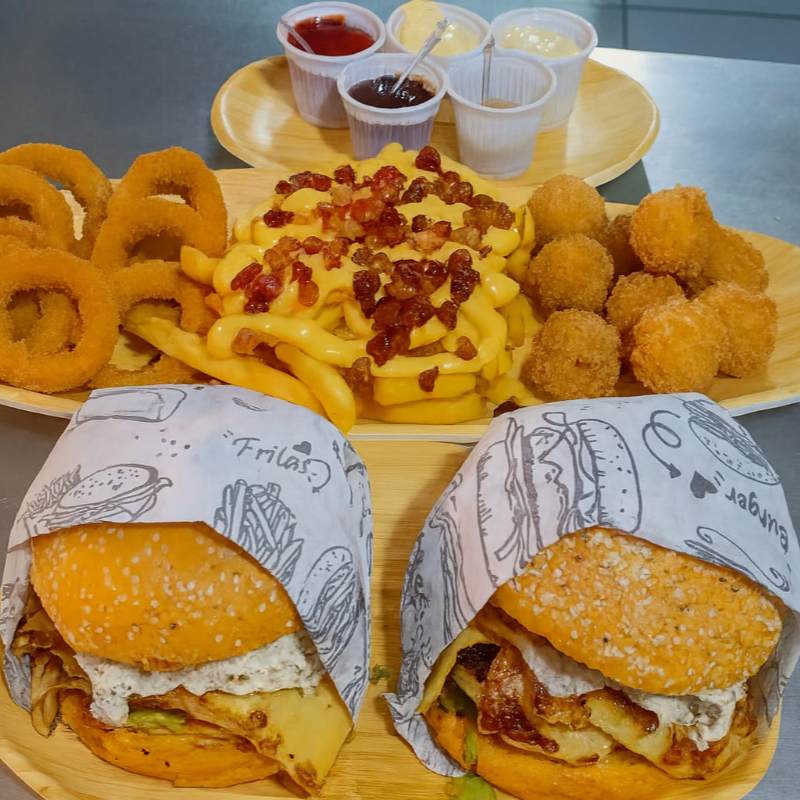 2 jerky, batata com cheddar e bacon , 8 anéis de cebola, 8 bolinhos de queijos . e 1 antartica de 1 litro [ Pão gourmet macio, 2 carnes artesanais de 90g, 2 queijo coalho grelhado na chapa, creme cheese, charque desfiada, salada kfc ]