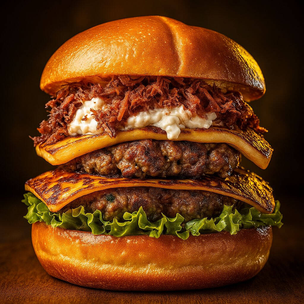 Pão gourmet macio, 2 carnes artesanais de 90g, queijo coalho grelhado na chapa, creme cheese, charque desfiada, alface, cebola caramelizada e tomate. Acompanhado de uma porção de batata crocante e 1 refrigerante Antártica em lata. Uma combinação irresistível de sabores sofisticados e texturas incríveis, ideal para quem busca algo único! [Pão gourmet macio, 2 carnes artesanais de 90g, queijo coalho grelhado na chapa, creme cheese, charque desfiada, salada kfc ]