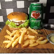 1 Favella Simples, uma porção de batata crocante e 1 refrigerante para completar a refeição. O combo perfeito para quem busca simplicidade com muito sabor! Pão macio, carne artesanal de 100g, e maionese de bacon,