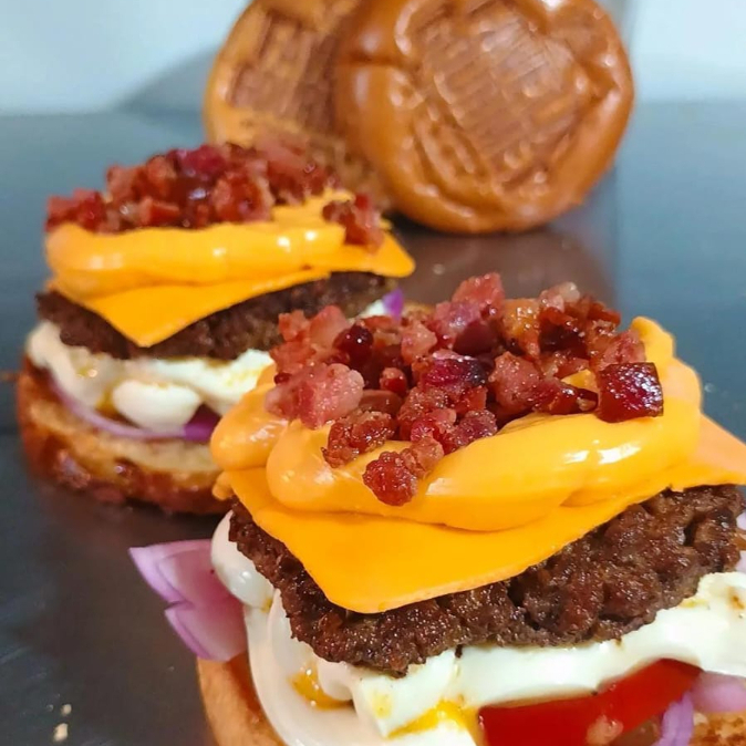 Pão gourmet macio, 2 carnes artesanais de 90g, queijo cheddar derretido, bacon crocantes, 2 anel cebola , maionese de bacon e molho cheddar cremoso. com creem cheese, salada kfc