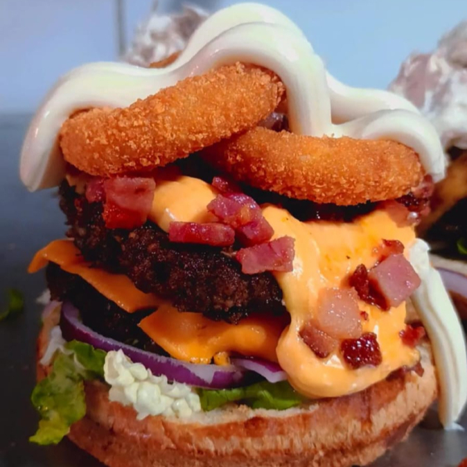 Pão artesanal, 2 carnes suínas de 90g, queijo cheddar, bacon em tiras, onion rings, maionese de bacon, molho cheddar, cream cheese, alface e tomate. Acompanha batata frita + 1 refrigerante lata 💣 Explosão de sabores para os fãs de pork! [Pão gourmet macio, 2 carnes artesanais de 90g, queijo cheddar derretido, bacon crocantes, 2 anel cebola , maionese de bacon e molho cheddar cremoso. com creem cheese ]