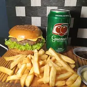 suculento gourmet beef, uma porção de batata crocante e 1 refrigerante em lata. A combinação perfeita de sabor e crocância, com o refresco para completar a refeição! [Pão gourmet macio, 2 carnes artesanais de 90g, queijo cheddar derretido, molho cheddar cremoso, bacon crocantes e maionese de bacon.]