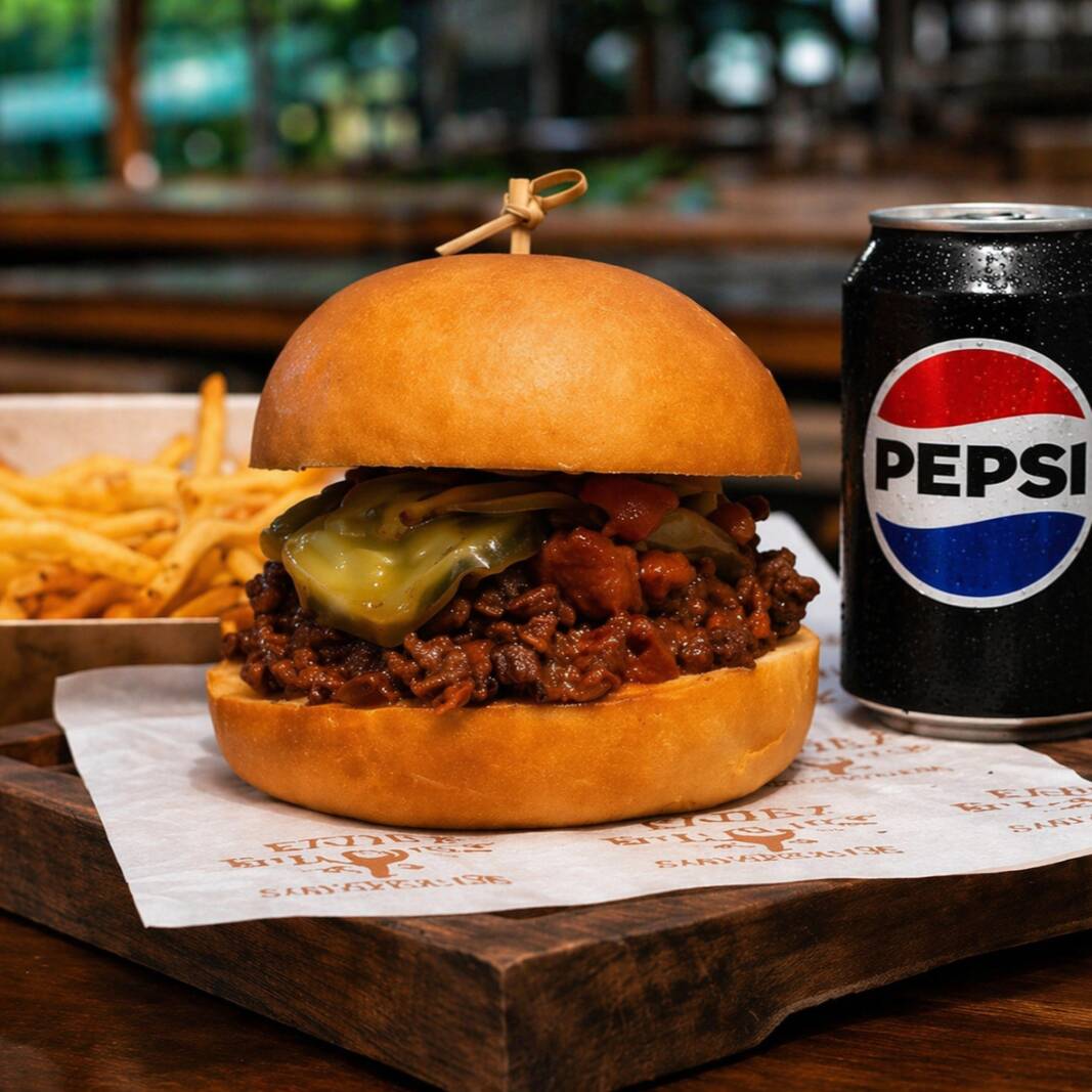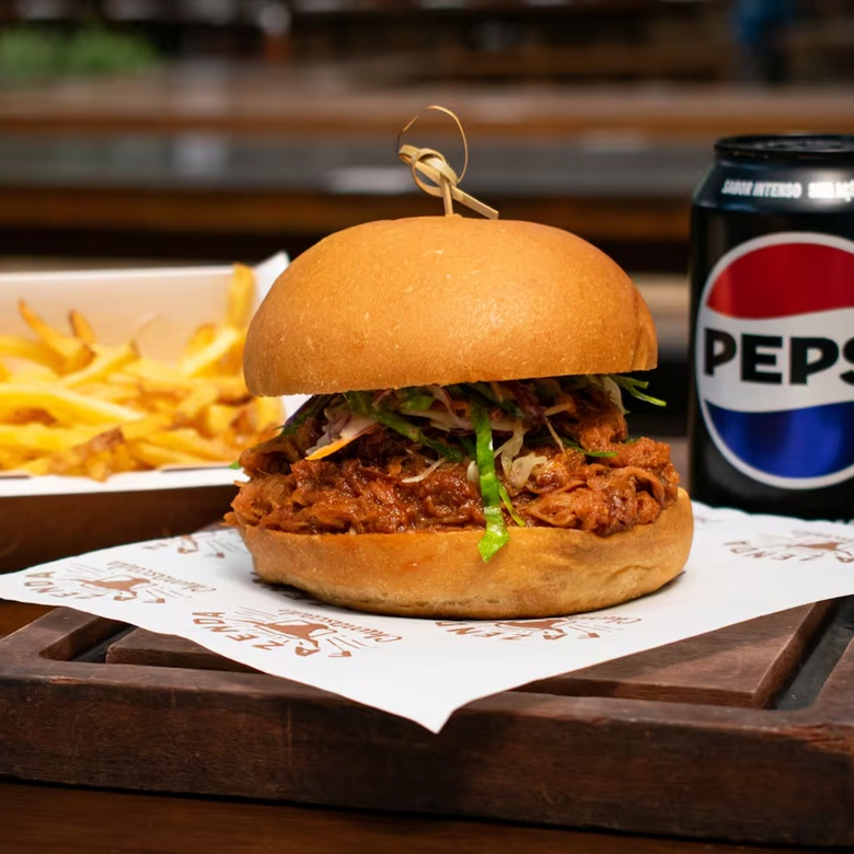 Pão brioche, nosso smoked brisket desfiado, molho Bbq e picles de pepino. Levemente apimentado. Acompanha 1 Batata Frita e 1 Bebida a sua escolha!
