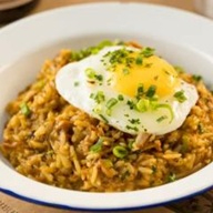Arroz caldoso, feito com costela bovina desfiada, purê de abóbora, finalizado com queijo parmesão e um ovo caipira estalado.