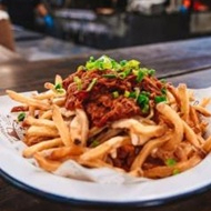 Batata frita da casa servida com creme de queijo cheddar e queijo prato e finalizada com um topping de costelinha suína desfiada.