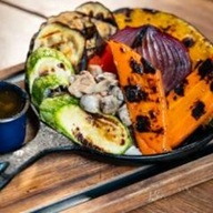 Panelinha de legumes da estação grelhados, finalizado com molho chimichurri.