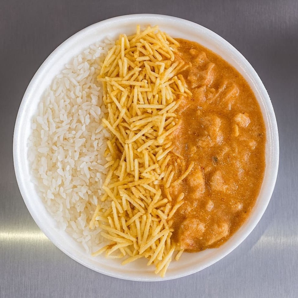 Marmita simples de strogonoff de frango cremoso acompanhada de arroz branco e Batata Palha.