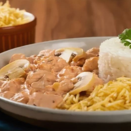Cubos de filé de frango refogado e cozido com páprica defumada, temperinhos e finalizado com nosso delicioso molho strogonoff.
