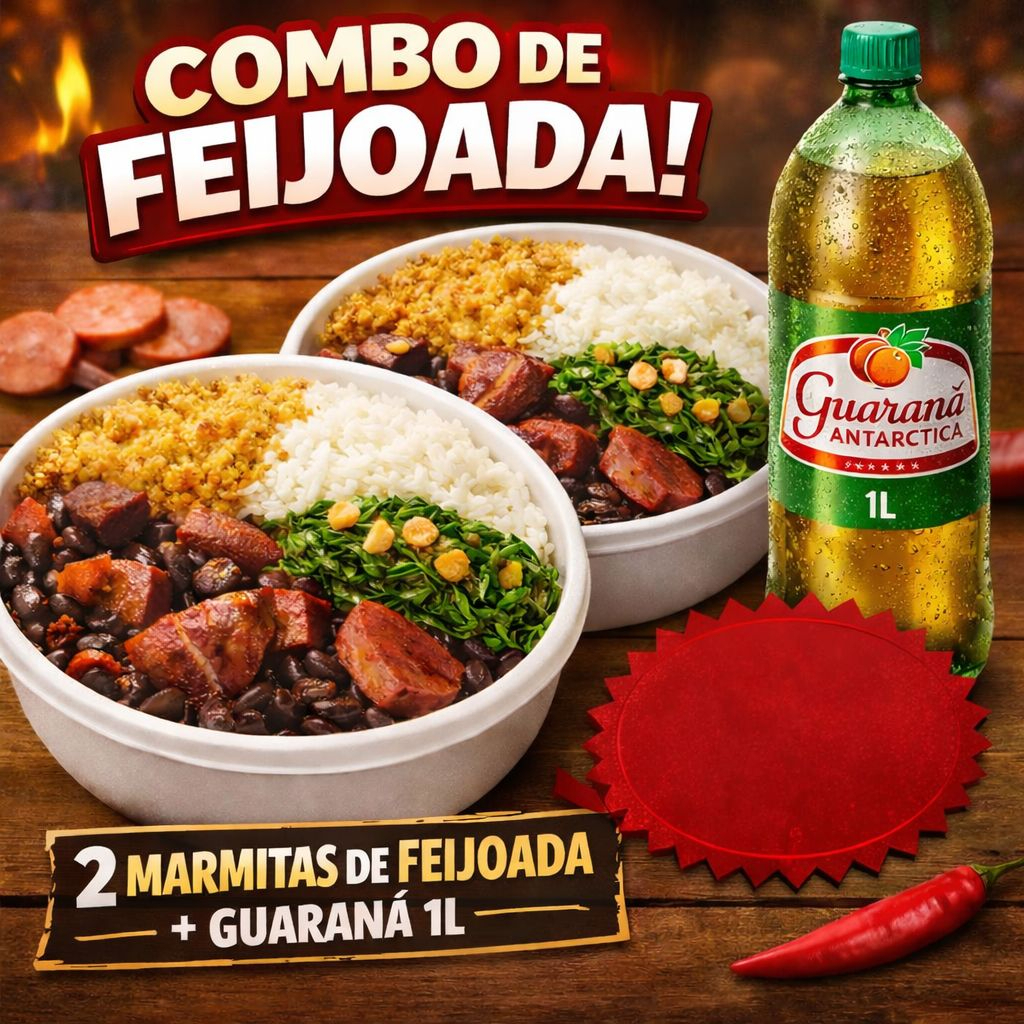Duas marmitas de feijoada composta por: Arroz Branco, Feijoada, farofa da casa, couve. se tiver disponibilidade na loja, te enviaremos grátis um saquinho de torresmo. + Refrigerante 1 litro.