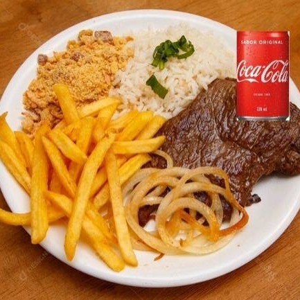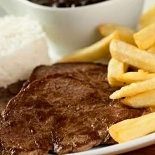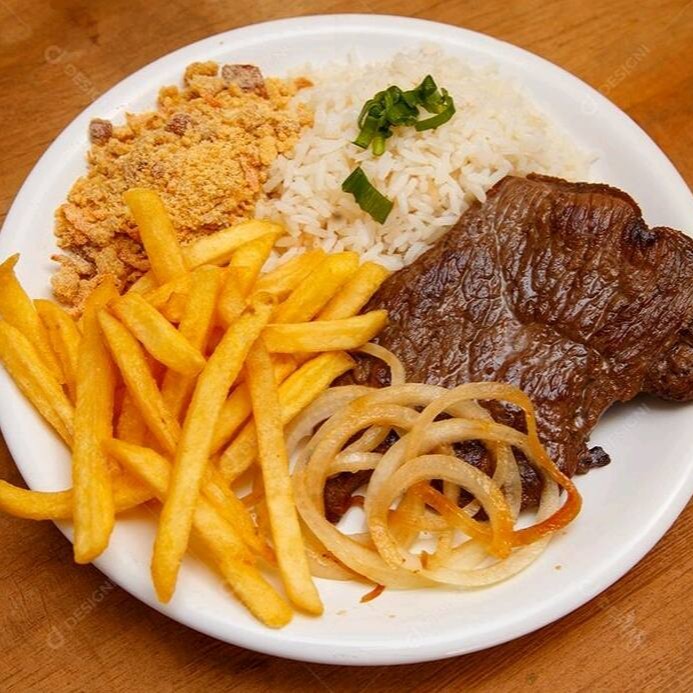 Acompanhado por arroz, Feijão Carioca temperado, Farofa Crocantes e batata frita Premium.