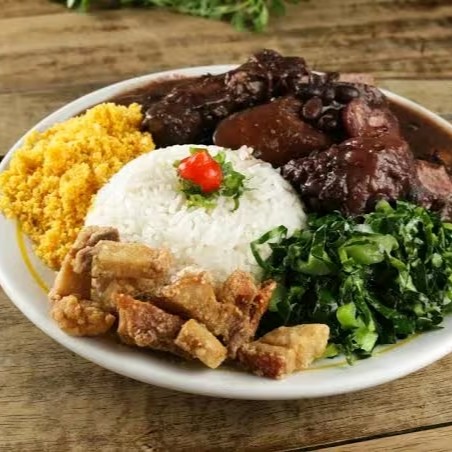 Feijoada magra (arroz, carne seca, lombo, costelinha, linguiça calabresa, couve, Vinagrete, farofa e torresmo.
