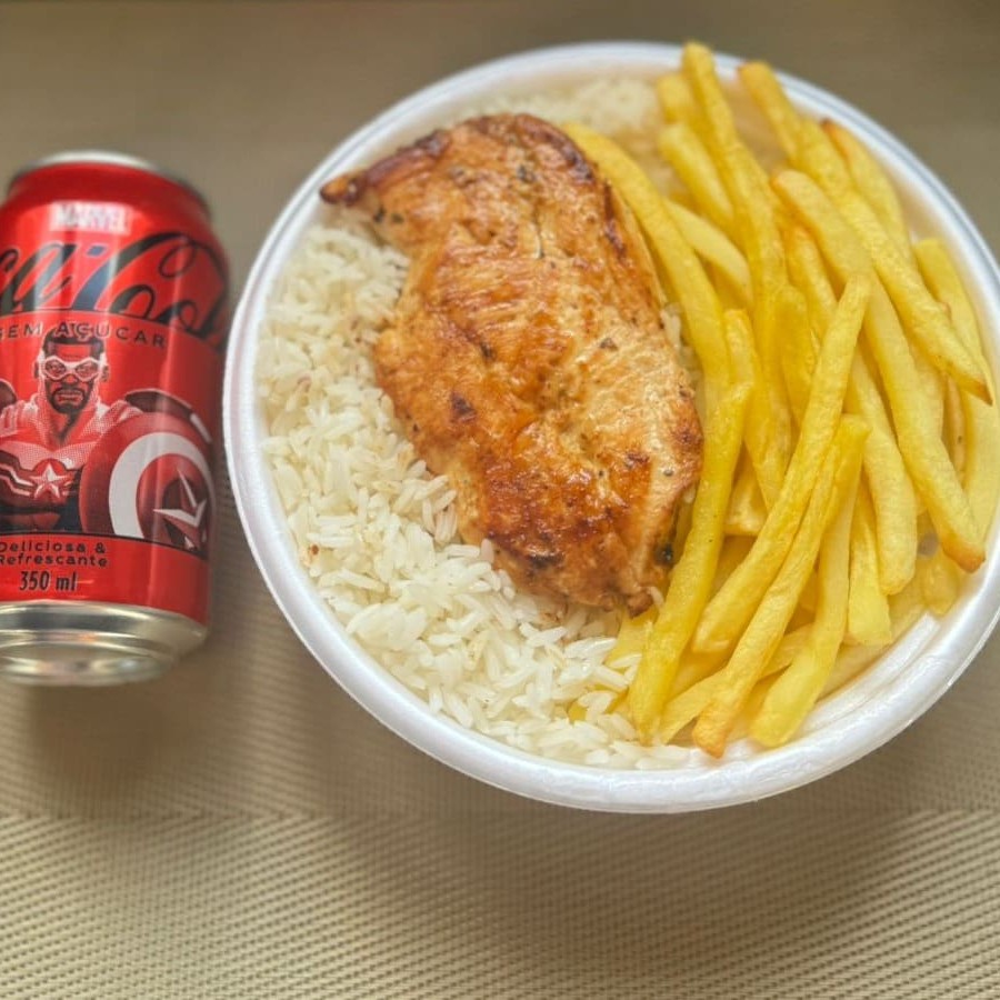 Marmita com delicioso filé de frango grelhado acompanhado de arroz branco, feijão e batatas fritas. Acompanha refrigerante Coca Cola lata Zero sem açúcar 350ml bem gelada. Marmita indicada para 01 pessoa.