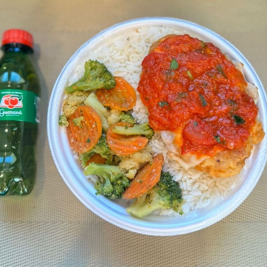 Marmita com delicioso filé de frango parmegiana (empanado na massa crocante coberto com molho de tomates e queijo) acompanhado de arroz branco e mix de legumes. Acompanha refrigerante Coca Cola lata Zero sem açúcar 350ml bem gelada. Marmita indicada para 01 pessoa.