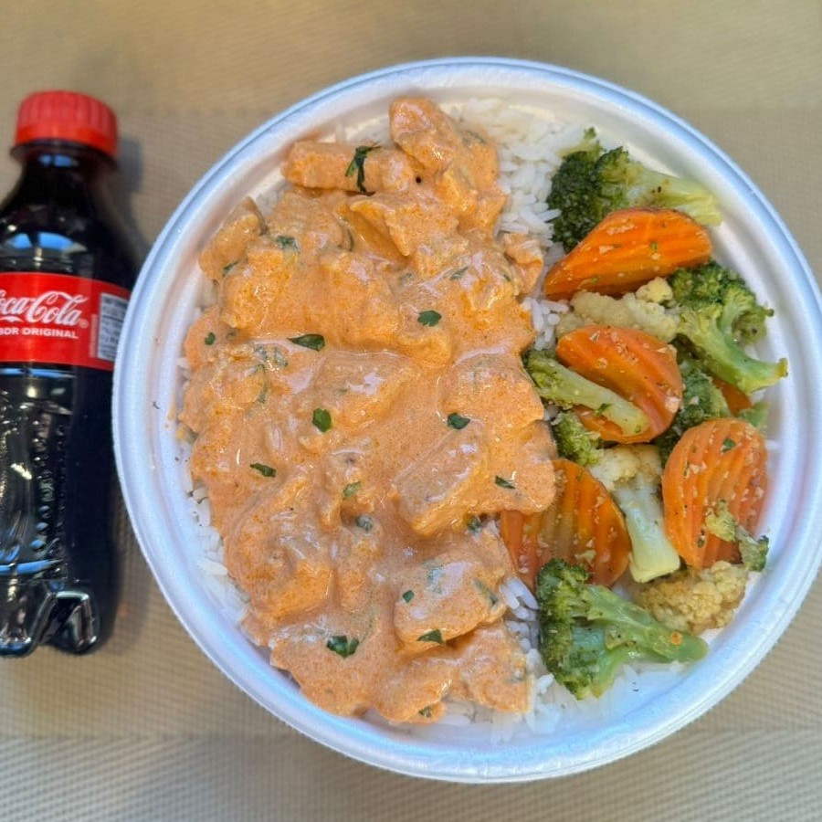 Marmita com delicioso filé de frango ao molho estrogonofe acompanhado de arroz branco e mix de legumes. Acompanha refrigerante pet Coca Cola bem gelado. Marmita indicada para 01 pessoa.