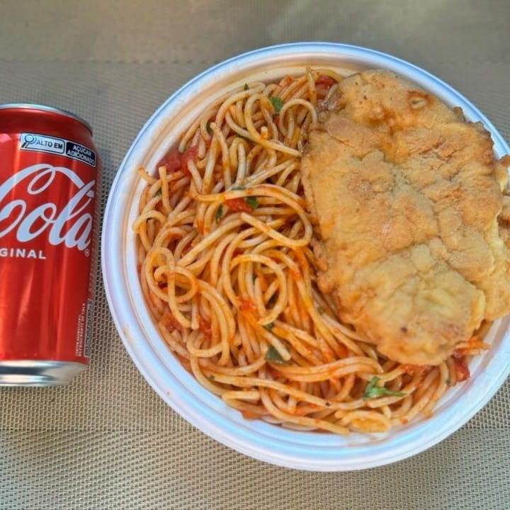 Marmita com delicioso filé de frango empanado na massa crocante acompanhado de macarrão espaguete ao molho de tomates. Acompanha refrigerante lata Coca Cola 350ml bem gelada. Marmita indicada para 01 pessoa.