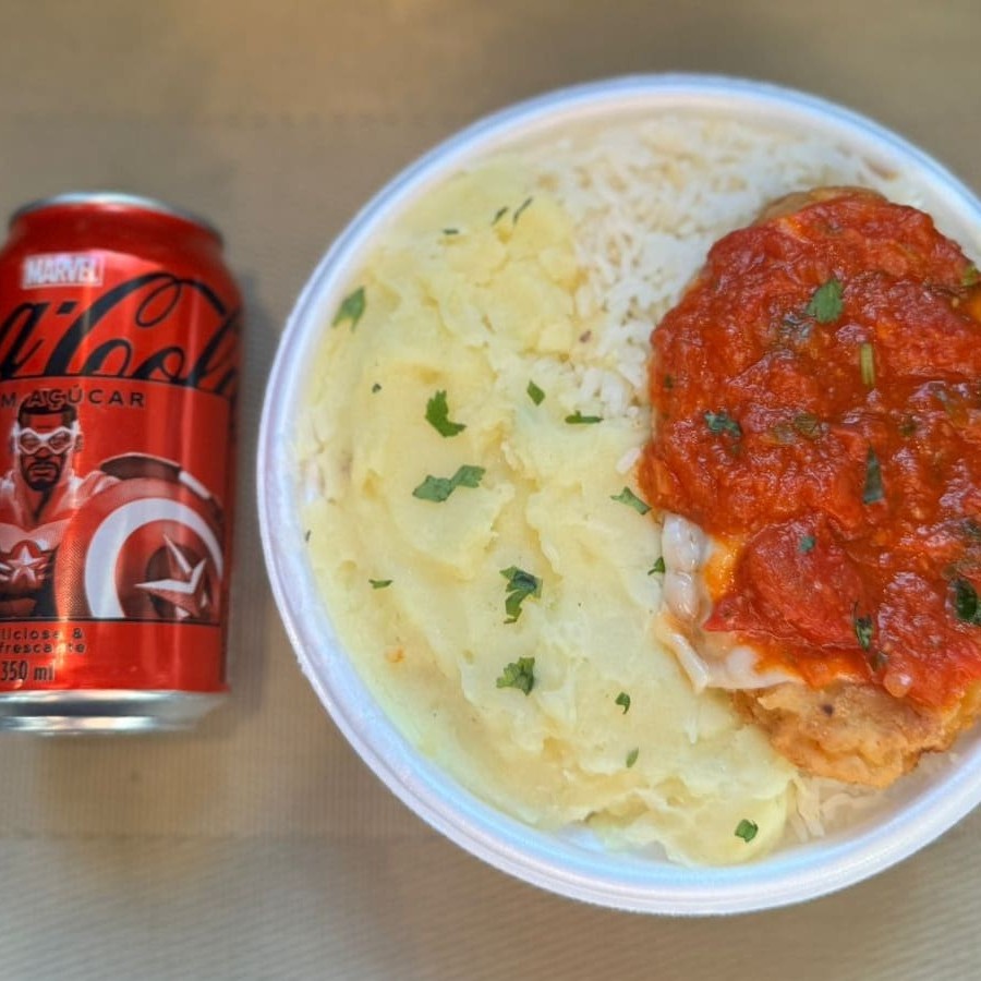 Marmita com delicioso filé de frango parmegiana (empanado na massa crocante coberto com molho de tomates e queijo) acompanhado de arroz branco e purê de batatas inglesas. Acompanha refrigerante Coca Cola lata Zero sem açúcar 350ml bem gelada. Marmita indicada para 01 pessoa.