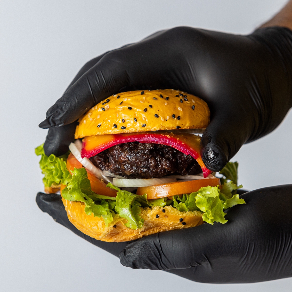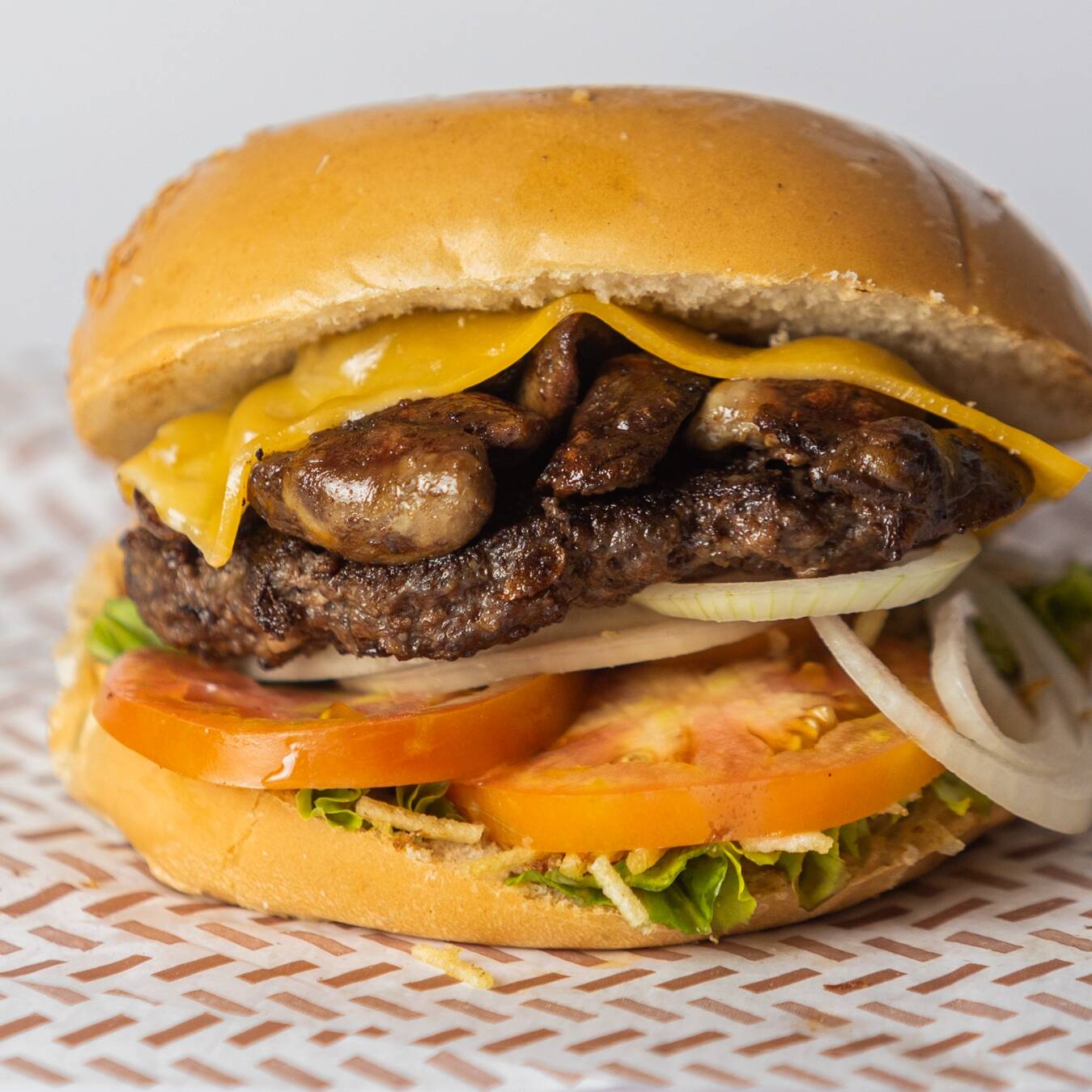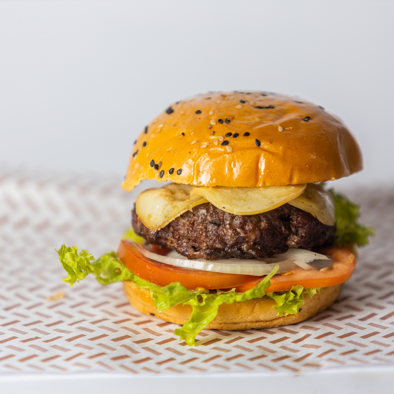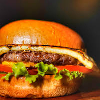 Pão gourmet, carne artesanal bovina, coração, queijo, batata palha e salada.