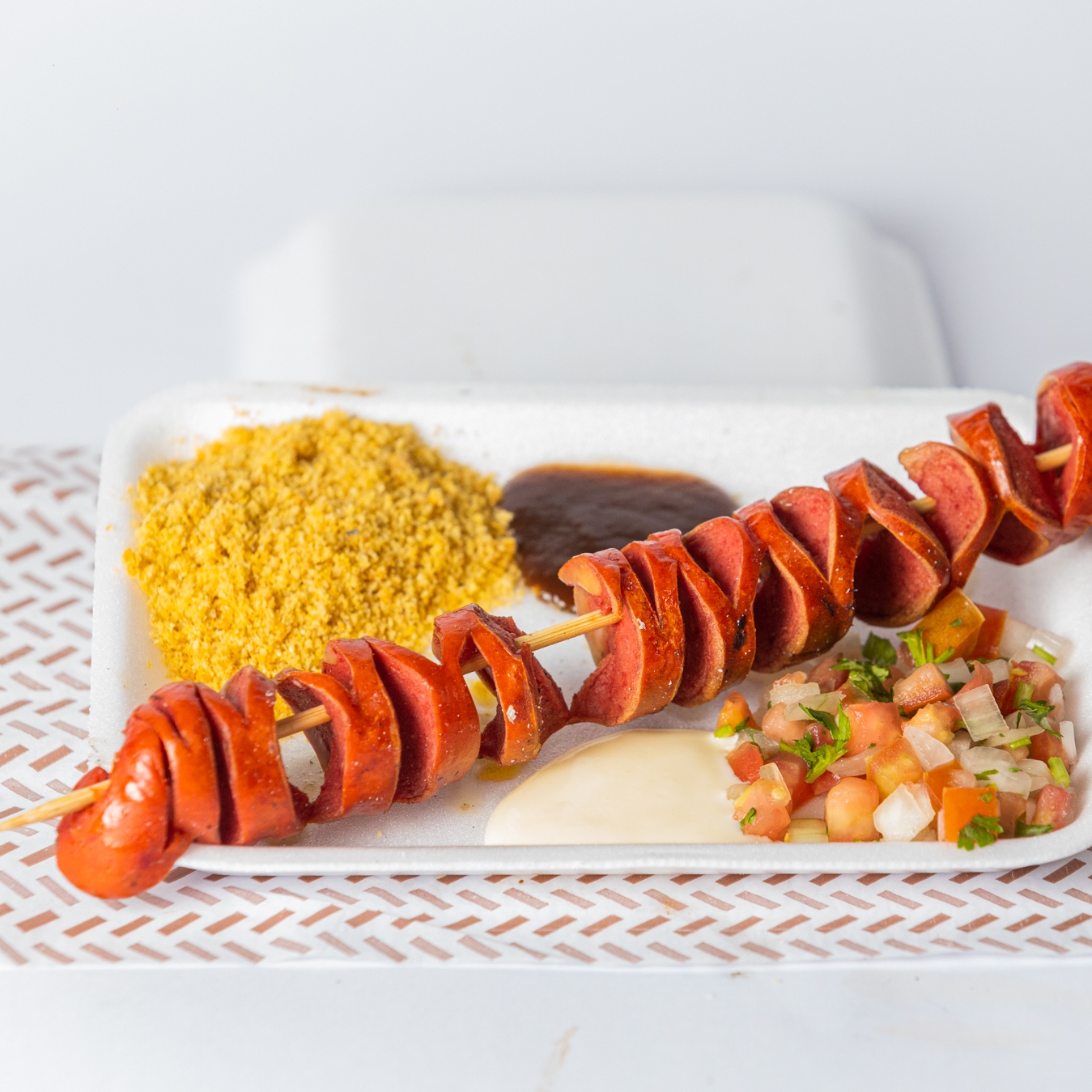 Pão seda,salsicha,charque,milho batata palha e verdura.