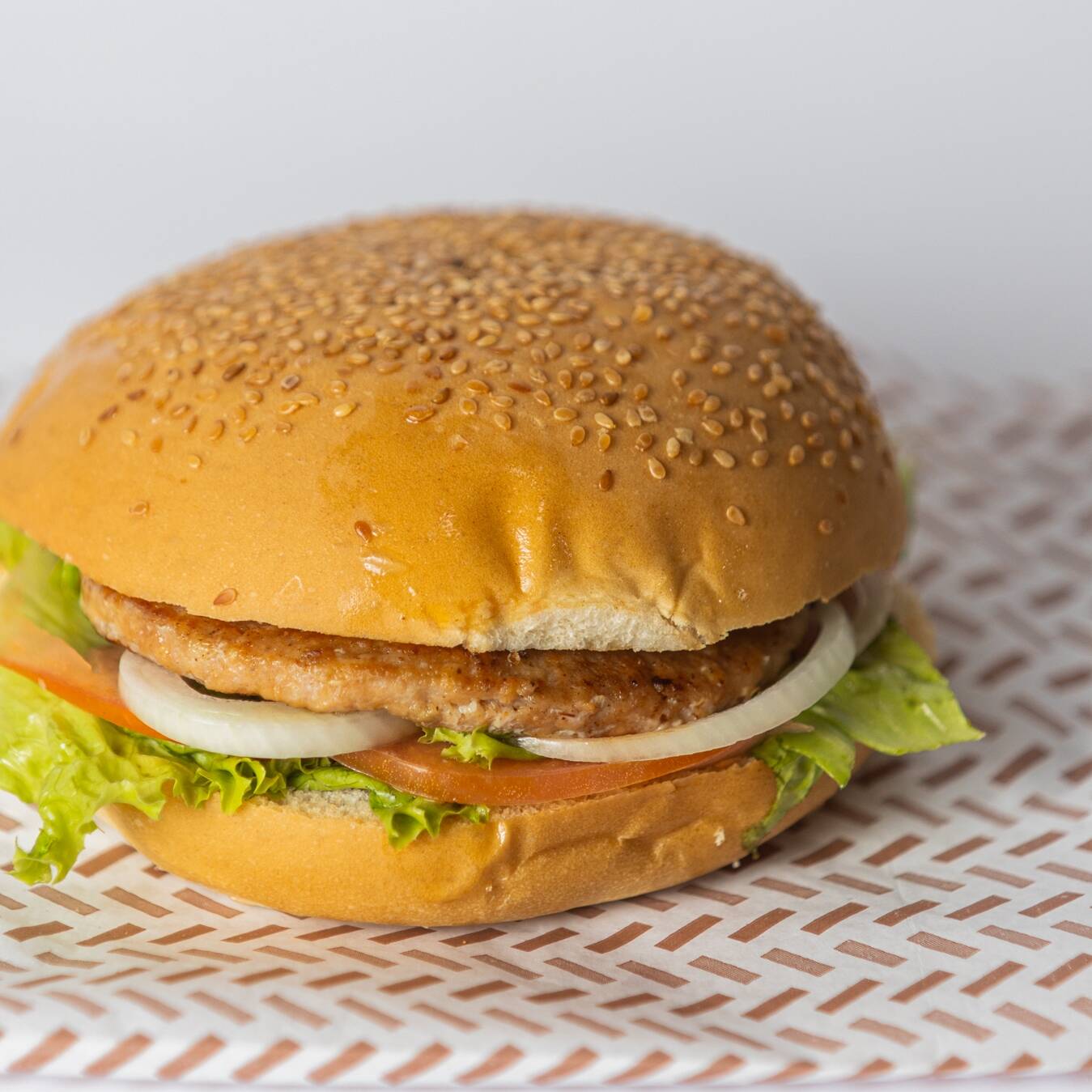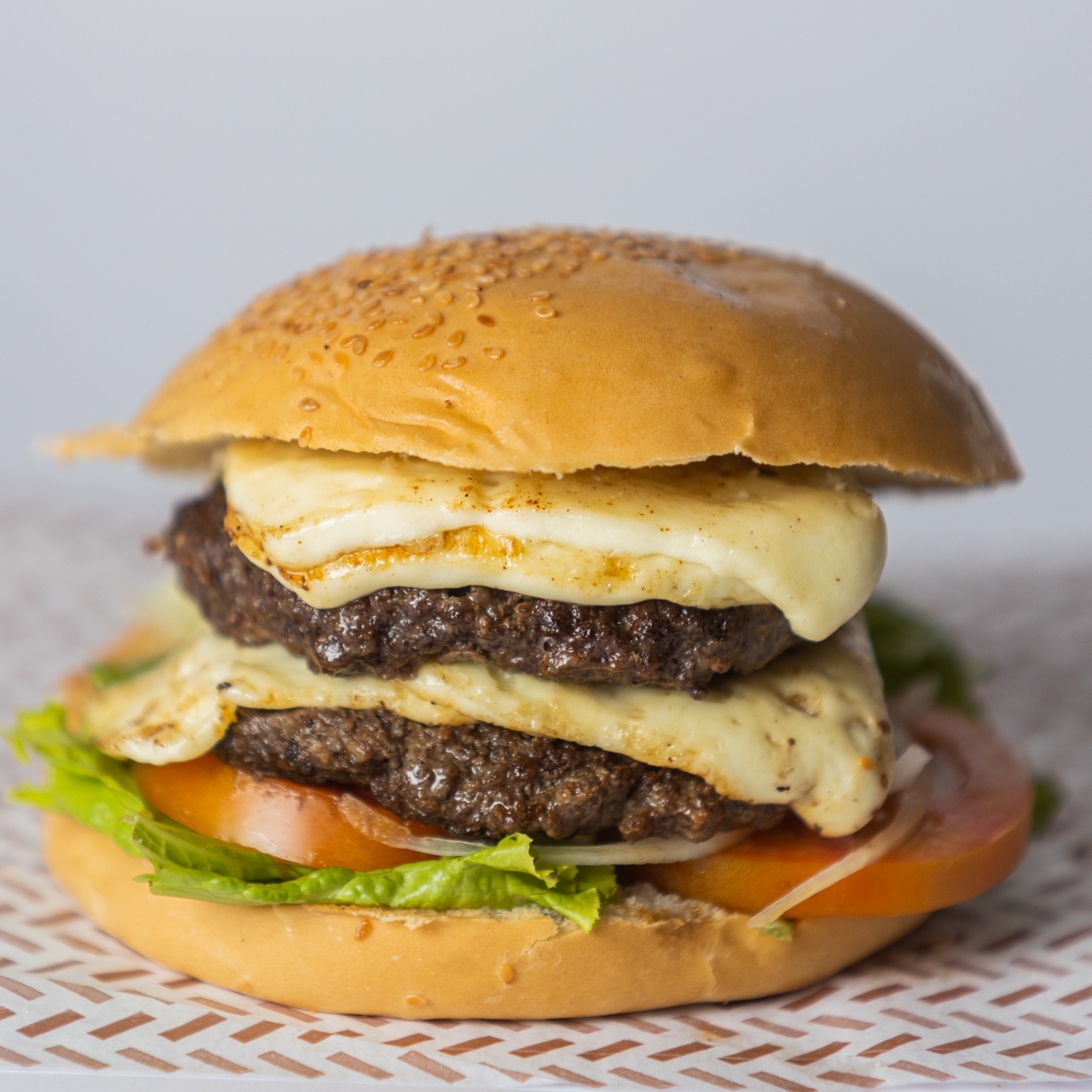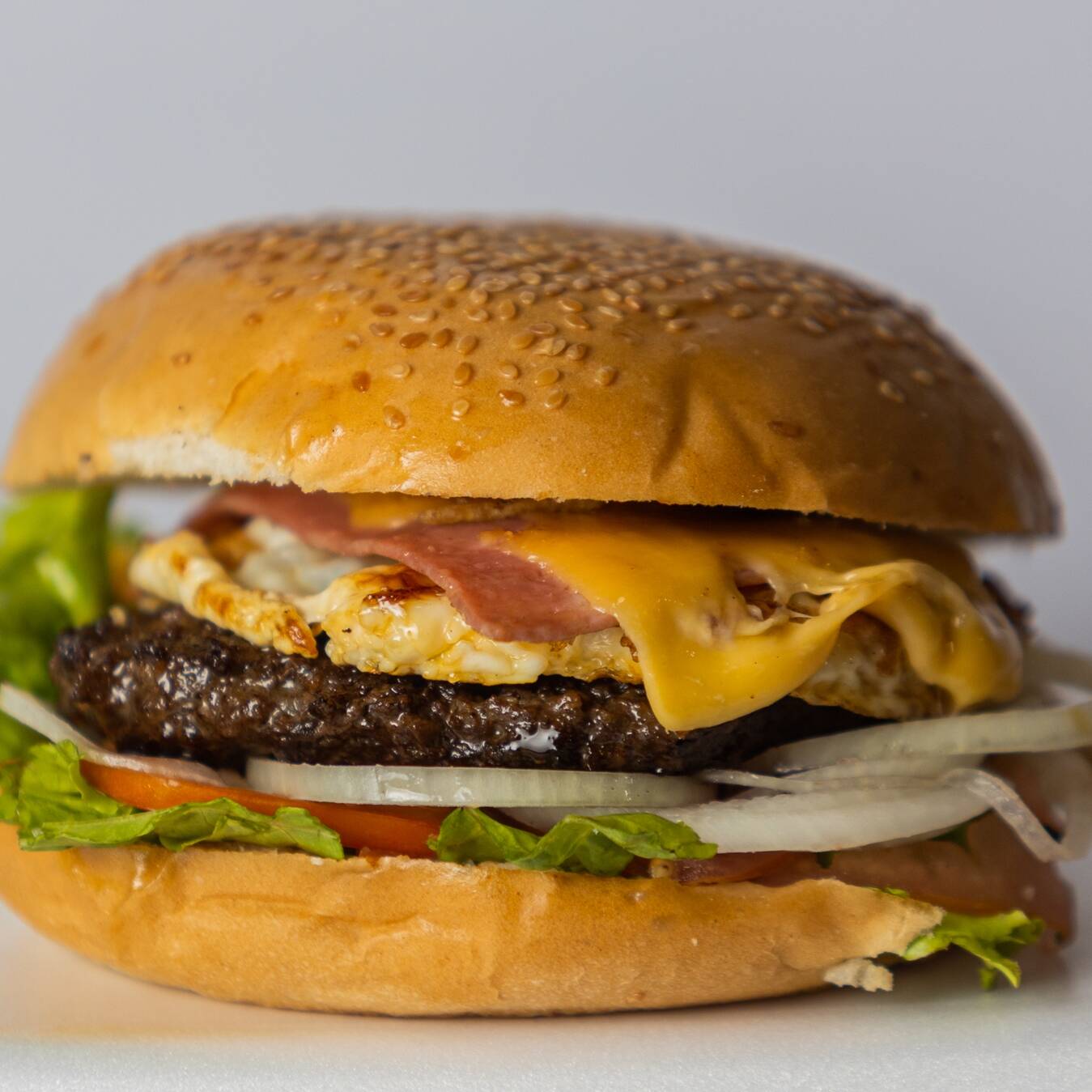Pão bola, carne artesanal bovina, presunto, ovo, queijo, batata palha e salada.