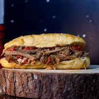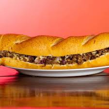 PÃO BAGUETE PARMESÃO, CARNE DE SOL EM CUBOS, QUEIJO COALHO, SALADA E MOLHO ESPECIAL.