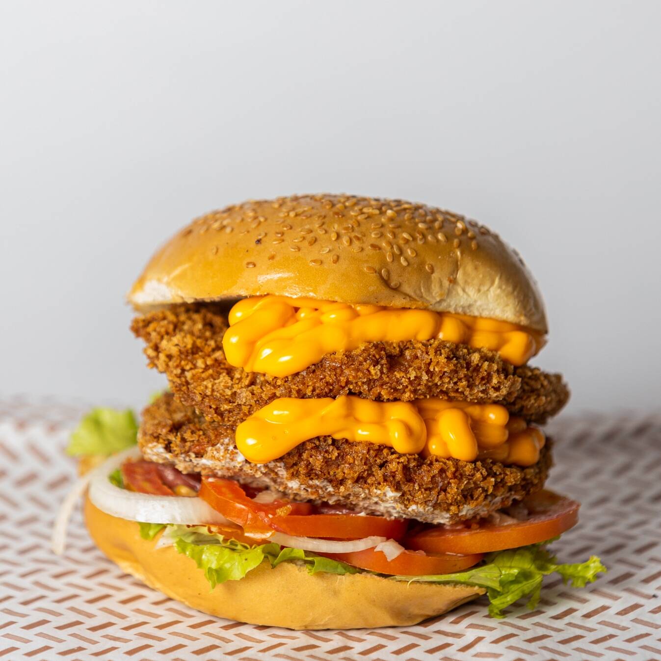 Pão artesanal, 2 carne de frango empanada, cheddar e salada.