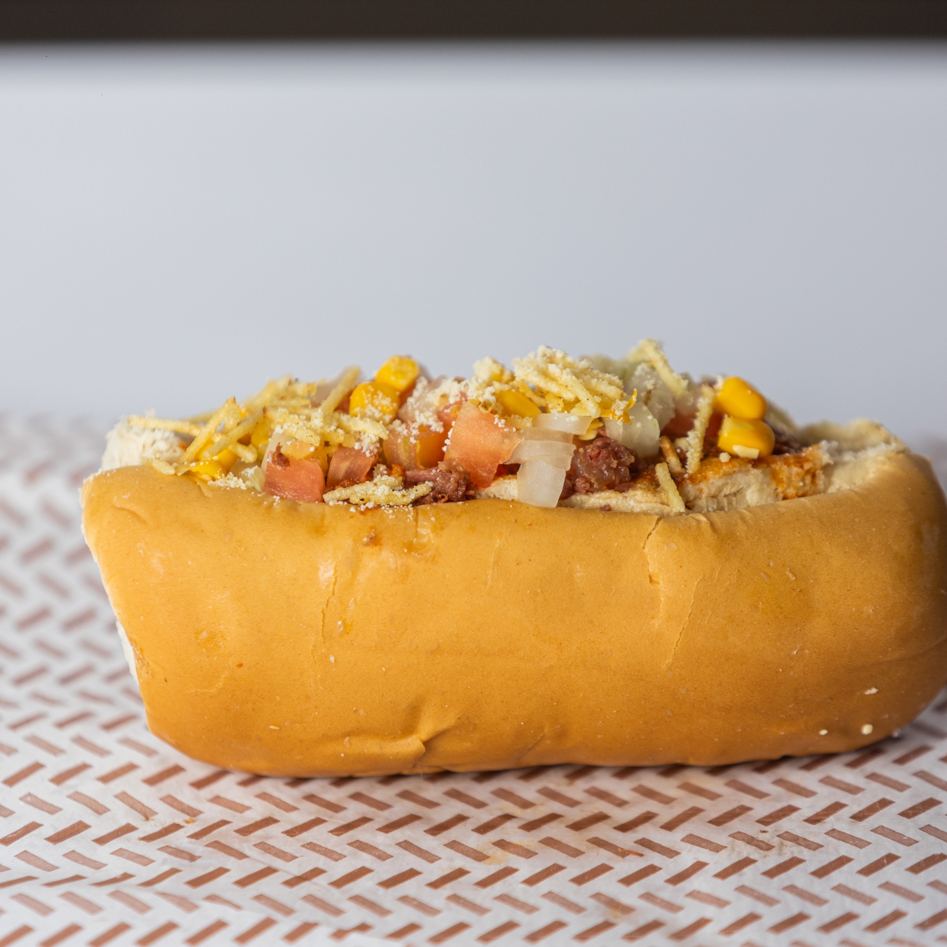Pão seda,salsicha,carne moida,milho,batata palha.