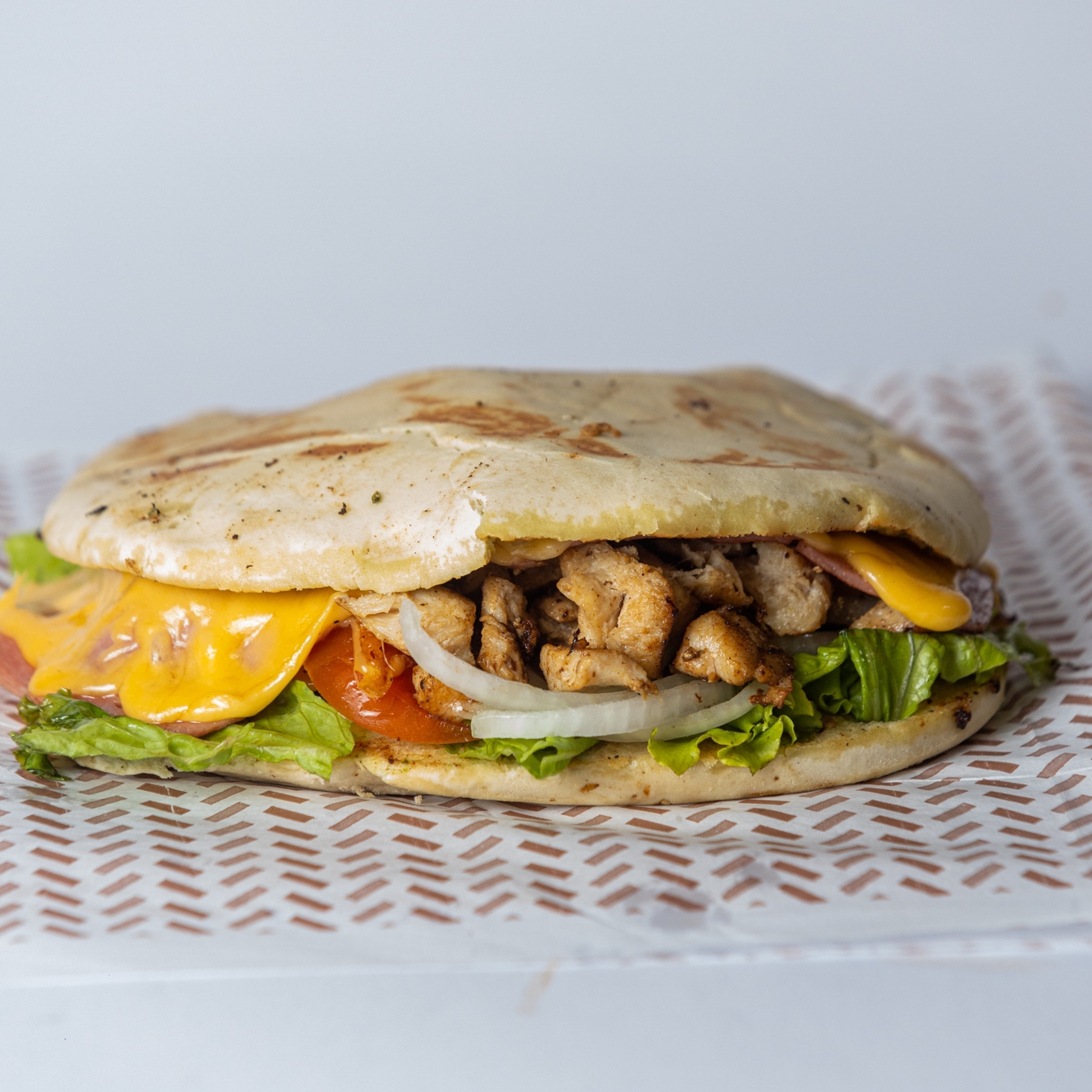 Pão sirio, 160g de frango em cubos,presunto,queijo,cebola caramelizada e salada.