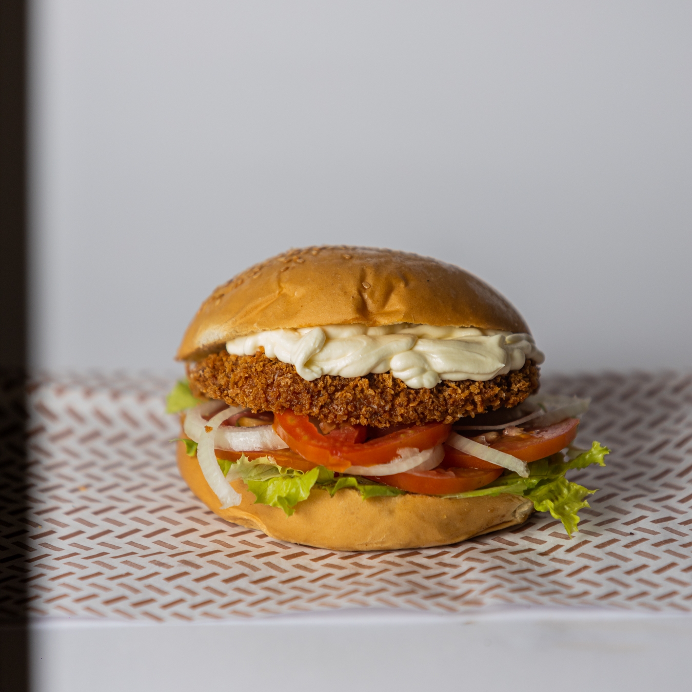 Pão artesanal, carne de frango empanada, cream cheese e salada.