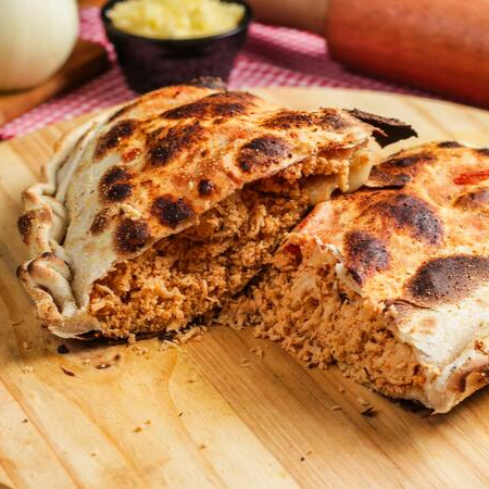 Massa artesanal, super recheado com queijo mussarela, charque desfiada, frango desfiado, cream cheese, tomate e cebola.