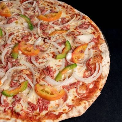 Massa artesanal, base de molho de tomate, queijo mussarela, charque desfiada, tomate, pimentão verde e cebola.