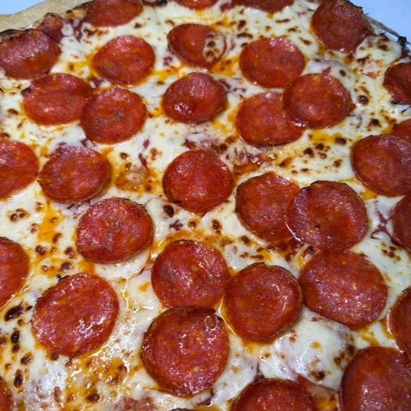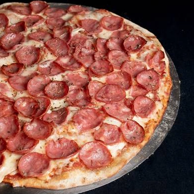 Massa artesanal, base de molho de tomate, queijo mussarela e muita calabresa fatiada.
