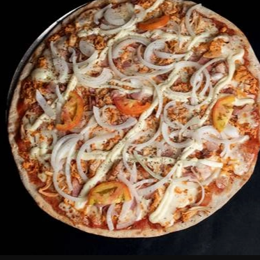 Massa artesanal, base de molho de tomate, queijo mossarela, frango desfiado, bacon, tomate, cebola e requeijão.