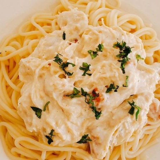 Espaguete Com Frango Desfiado Ao Molho Branco.