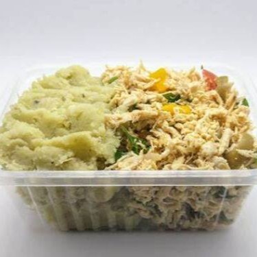 Frango desfiado, acompanhado de arroz e purê de macaxeira. Aprox. 350gr