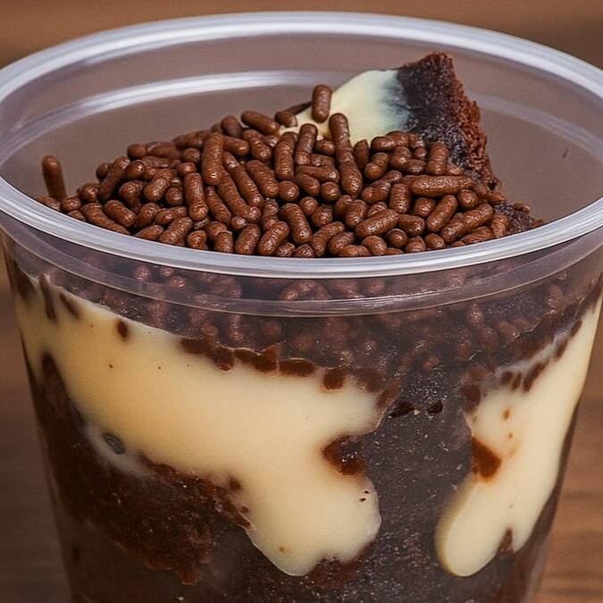 Cubinhos de brownie fit sem glúten sabor cacau e mix de castanhas, envolvido com creme de fit condensado (zero lactose). Finalzado com chocolate granulado e nibs de cacau.