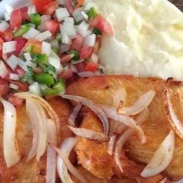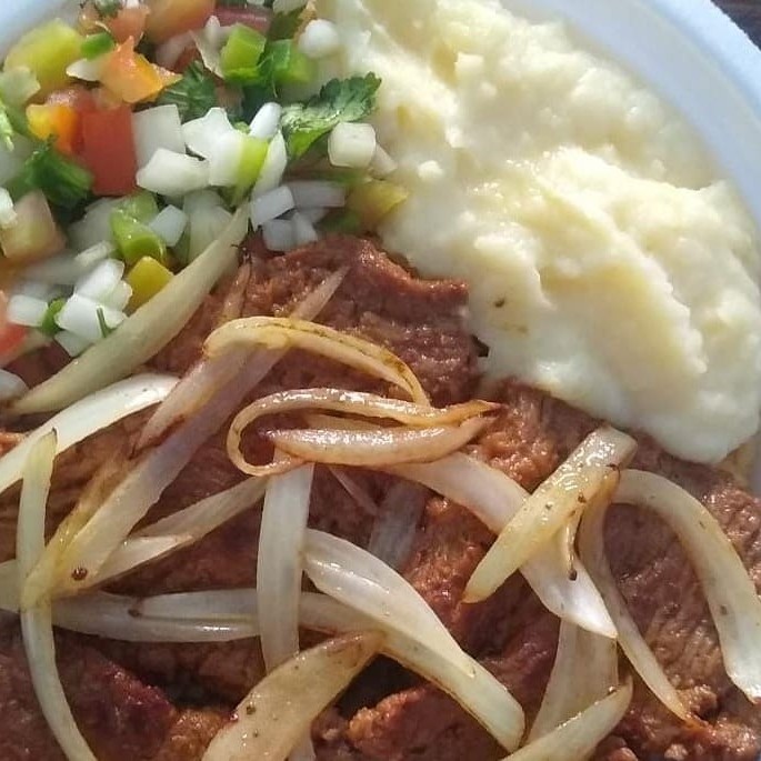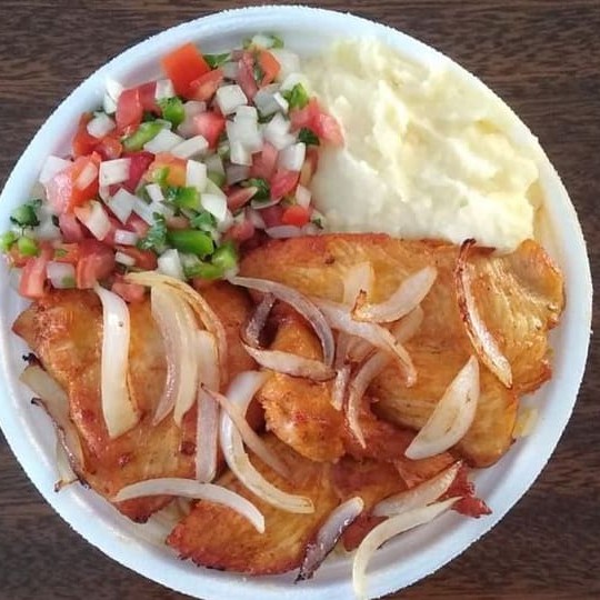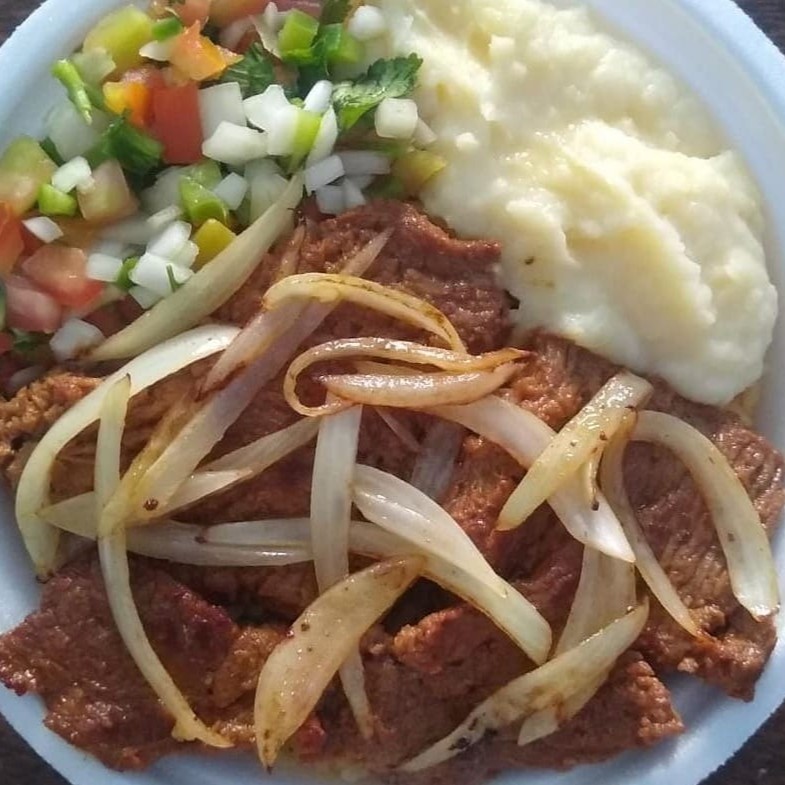 Almoço saboroso, bem temperado, acompanhado de: Feijão de sua preferência, arroz, macarrão, Purê, vinagrete e carne de primeira em Bife acebolado. Embalagem marmita redonda rasa.