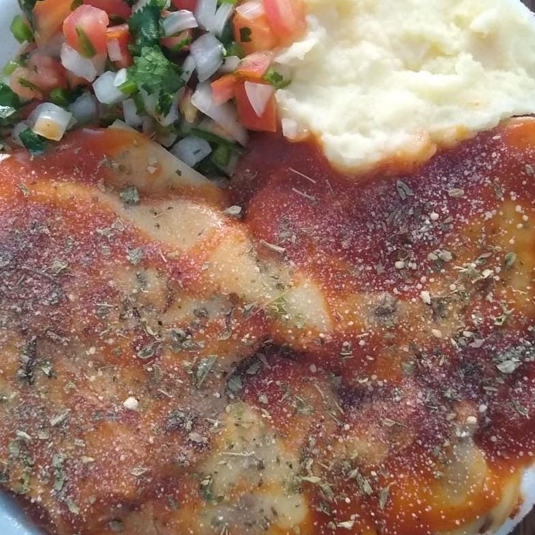 Uma refeição do tamanho da sua fome com Feijão de sua preferência, arroz, macarrão, vinagrete, Purê, um delicioso filé de frango empanado ao molho de parmegiana, orégano, queijo ralado e queijo Mussarela.