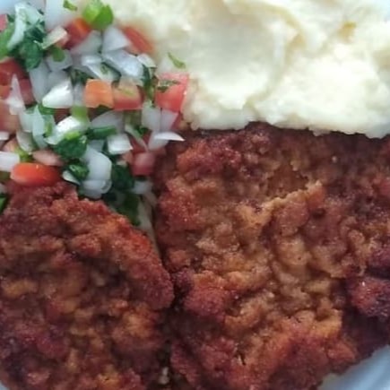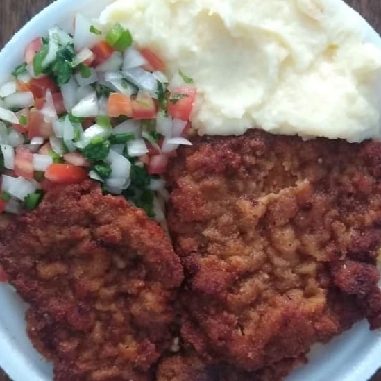 Almoço saboroso acompanhado de: Feijão de sua preferência, arroz, macarrão, Purê, vinagrete e bife de primeira empanado. Embalagem marmita redonda rasa.
