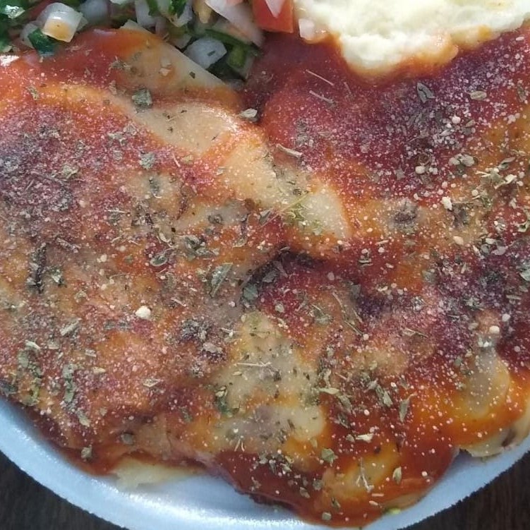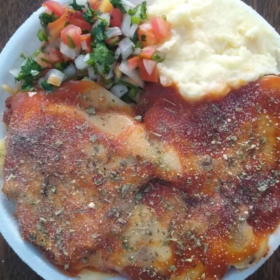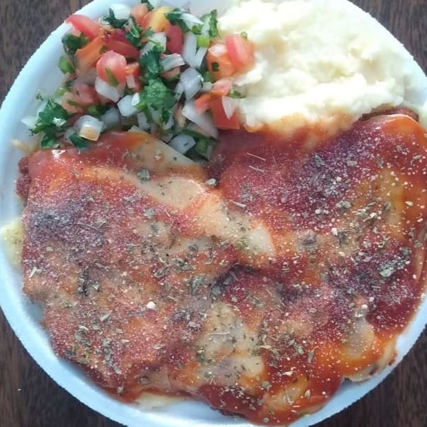 Almoço surpreendente com Feijão de sua preferência, arroz, macarrão, Purê, vinagrete com um delicioso frango empanado ao molho parmegiana, orégano, queijo ralado e queijo mussarela. Embalagem marmita redonda rasa.