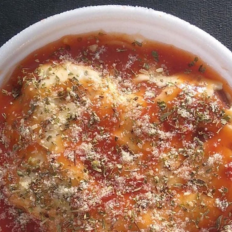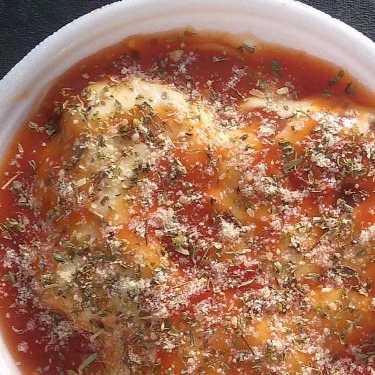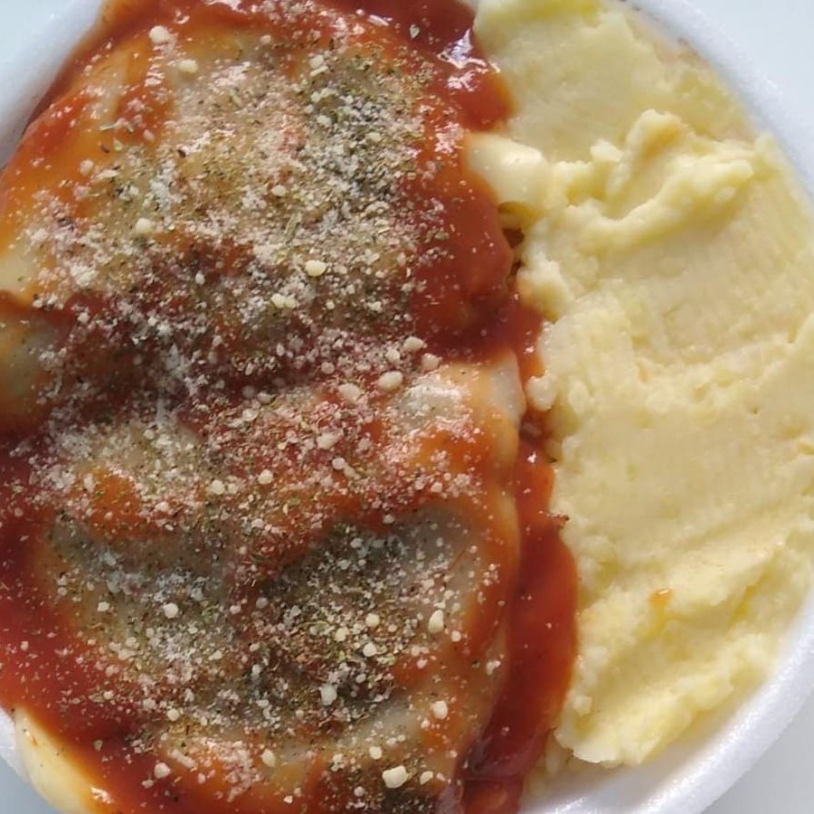 Macarrão ou arroz, purê, frango empanado, molho Parmegiana, queijo ralado, oregano, queijo Mussarela e vinagrete se desejar. Na embalagem redonda funda.