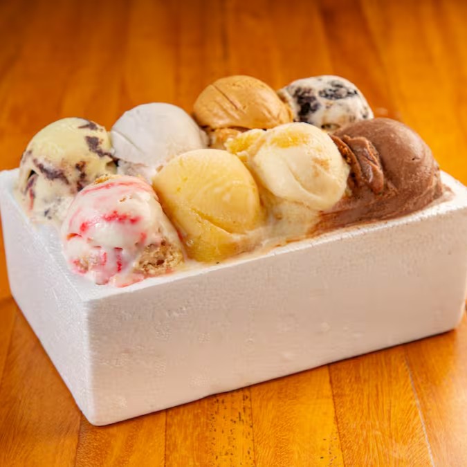 Irresistível caixa com 8 bolas de sorvete à sua escolha.