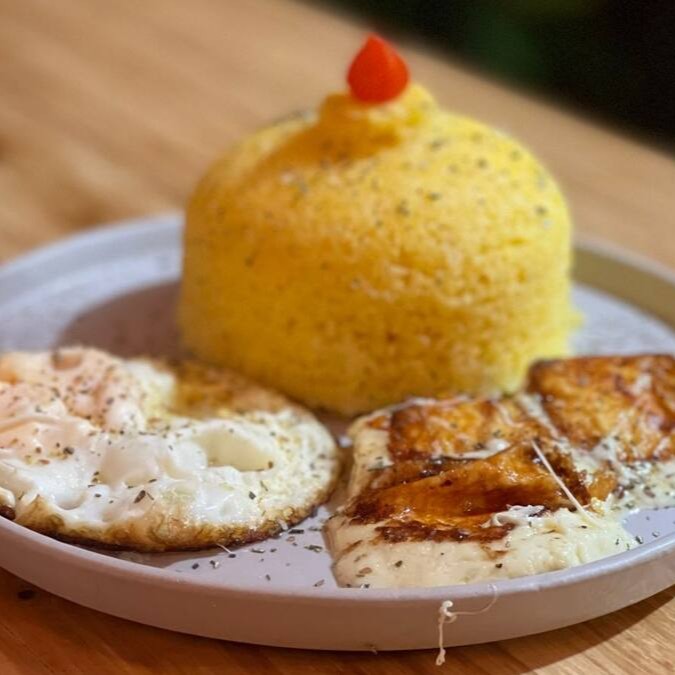 Cuscuz simples acompanhado de ovo estrelado e queijo coalho